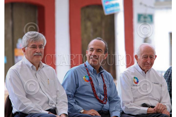 HUEYTLALPAN, PUEBLA, 12NOVIEMBRE2008.- Oscar de Buen Richkarday, Subsecretario de Infraestructura, Felipe Calderón Hinojosa, Presidente de México y Luis H. Álvarez, director Comisión Nacional para el Desarrollo de los Pueblos Indígenas, durante la inauguración del camino Olintla Cuatro Caminos que se llevo a cabo en dicha entidad. FOTO: ALFREDO GUERRERO/CUARTOSCURO.COM