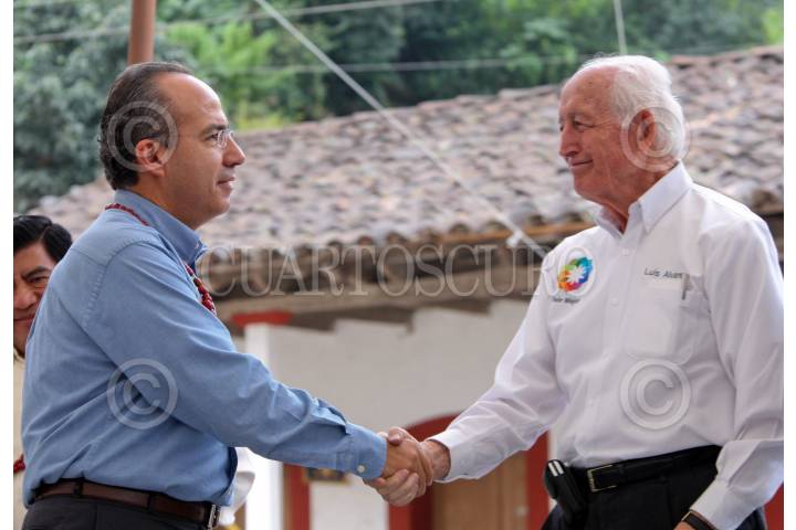 HUEYTLALPAN, PUEBLA, 12NOVIEMBRE2008.- Felipe Calderón Hinojosa, Presidente de México y Luis H. Álvarez, director Comisión Nacional para el Desarrollo de los Pueblos Indígenas, durante la inauguración del camino Olintla Cuatro Caminos que se llevo a cabo en dicha entidad. FOTO: ALFREDO GUERRERO/CUARTOSCURO.COM