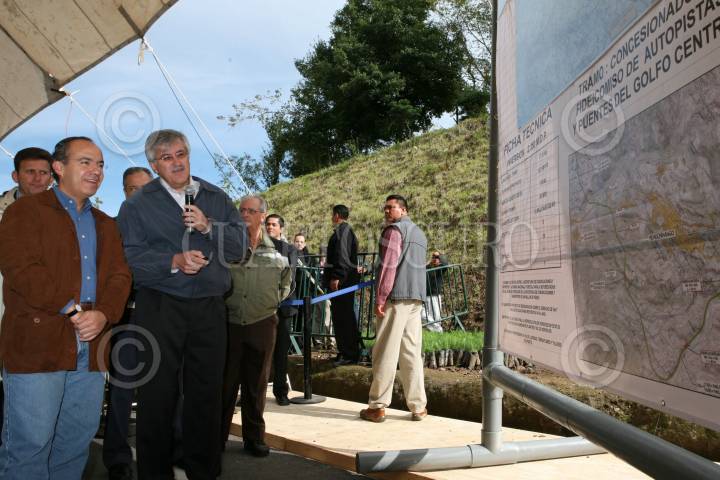 HUACHINANGO, PUEBLA, 19JULIO2007.- Felipe Calderón Hinojosa, Presidente de México y Oscar de Buen Richkarday, Subsecretario de Infraestructura, durante la entrega de la concesión del tramo carretero Nuevo Necaxa-Tihuatlán durante la inauguraciñon del tramo carretero Tejocotal-Nuevo-Necaxa. FOTO: ALFREDO GUERRERO/CUARTOSCURO.COM