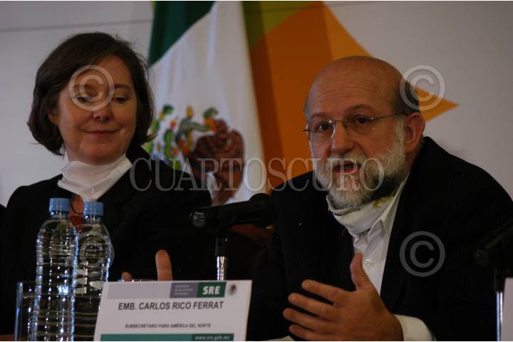 MÉXICO D.F., 07MAYO2009.- Carlos Rico Ferrat, Subsecretario para America del Norte de la Secretaria de Relaciones Exteriores, encabezo la sencilla ceremonia con la cual se agradeció la cooperación de los Estados Unidos durante la emergencia por la presencia del virus de la Influenza Humana (AH1N1) en nuestro país, el subsecretario fue acompañado por Mauricio Hernández Ávila, Subsecretario de Prevención y Promoción de la Salud y de Leslie Basset, Encargada de Negocios de la embajada de los Estados Unidos, esta ceremonia se realizó en las instalaciones de la Secretaria de Relaciones Exteriores. FOTO: GUILLERMO PEREA/CUARTOSCURO.COM