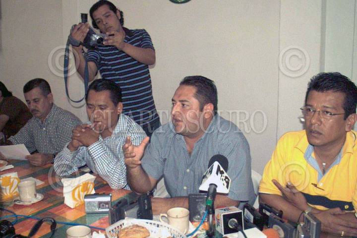 CHILPANCINGO, GUERRERO, 31ENERO2005.- Los regidores Julio Cesar Aguirre (PRD), Jorge Miranda Huesca (PC), Rigoberto Ramos Romero (PAN) y José Isabel Arcos (PRD), ofrecieron una conferencia de prensa para denunciar el desvio de recursos por parte del alcalde de Chilpancingo, Saúl Alarcón Abarca y destinarlos a la campaña de Héctor Astudillo Flores, candidato al gobierno por la coalición "Todos por Guerrero". Foto: Oscar Alvarado/CUARTOSCURO
