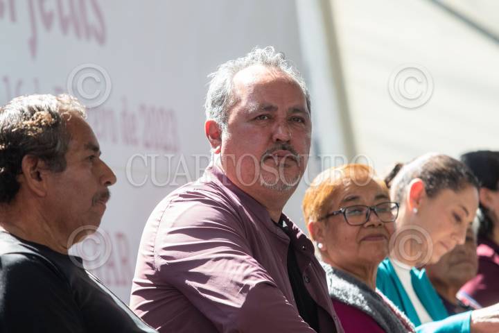 Rigoberto Salgado Vázquez, secretario del Bienestar de la CDMX, durante la entrega de tarjetas del Bienestar en el Hospital Militar de Chivatito.