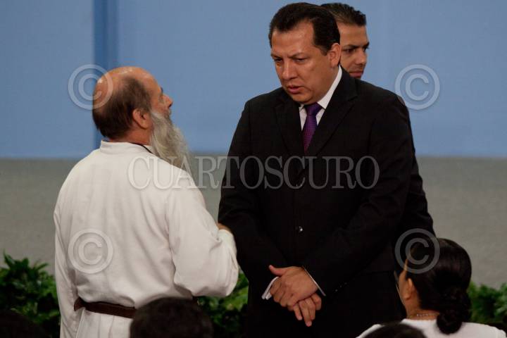 MÉXICO, D.F., 24MAYO2011.- El padre Flor de María Rigoni, director de la Casa del Migrante y el Albergue Belén, conversó con Raúl Plascencia Villanueva, presidente de la Comisión Nacional de Derechos Humanos, durante la ceremonia en la que firmó el decreto que expide la Ley de Migración en la residencia oficial de Los Pinos. FOTO: MOISÉS PABLO/CUARTOSCURO.COM