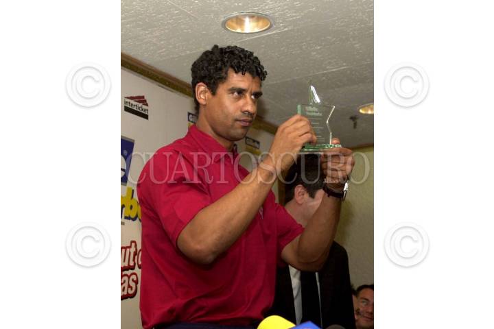 Frank Rijkaard, director técnico del Barcelona, recibe reconoocimiento por su trayectoria, durante la conferencia de prensa ofrecida a los medios mexicanos. FOTO: Sandra Perdomo/CUARTOSCURO.COM