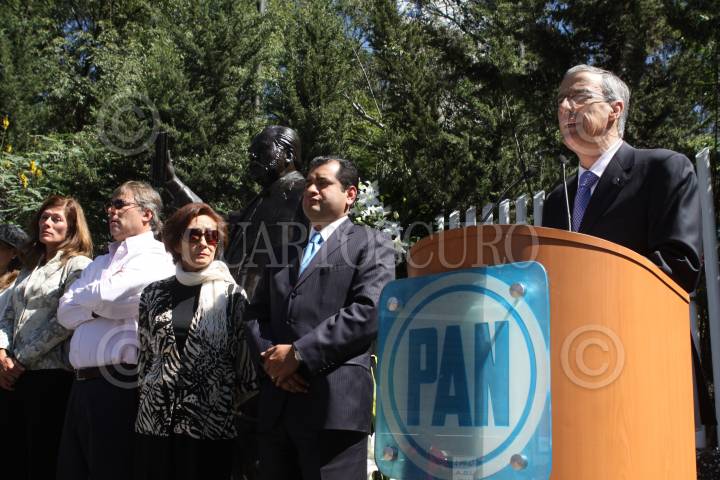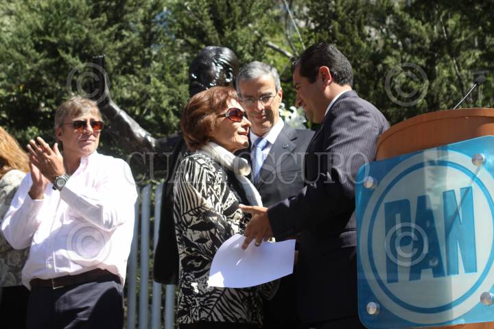 MÉXICO, D.F., 01OCTUBRE2010.- José González Morfín, coordinador de los senadores panitas ofreció unas palabras en la ceremonia de conmemoración del XXI aniversario luctuoso de Manuel J. Clouthier del Rincón "Maquío", candidato panista a la presidencia en el año de 1988. Ésto fue en el monumento dedicado a su memoria en el parque Vito Alessio. De izquierda a derecha de la imagen se aprecia a dos hijos de "Maquío", Rebeca y Juan Pablo Clouthier Carrillo, así como su viuda Leticia Carrillo y Obdulio Ávila, dirigente local blanquiazul. FOTO: MOISÉS PABLO/CUARTOSCURO.COM