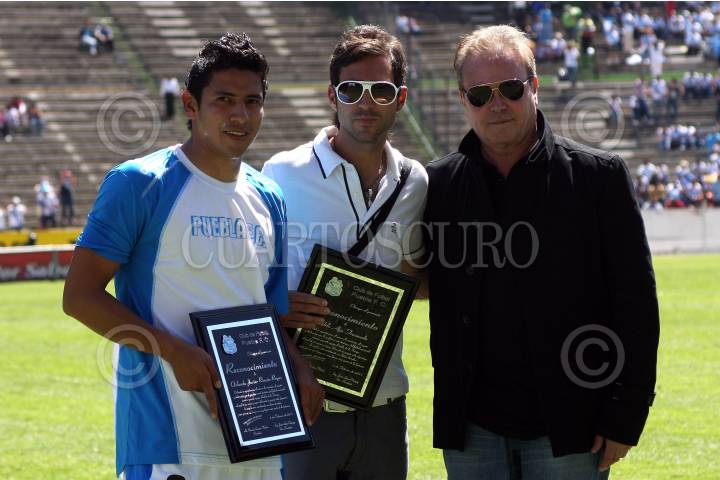 PUEBLA, PUEBLA, 20FEBRERO2011.- Orlando Rincón y Pablo Aja, recibieron un reconocimiento en manos del presidente del equipo Puebla, Ricardo Henaine, por su permanencia en la escuadra camotera desde su ascenso a la primera división. FOTO: FRANCISCO GUASCO/CUARTOSCURO.COM