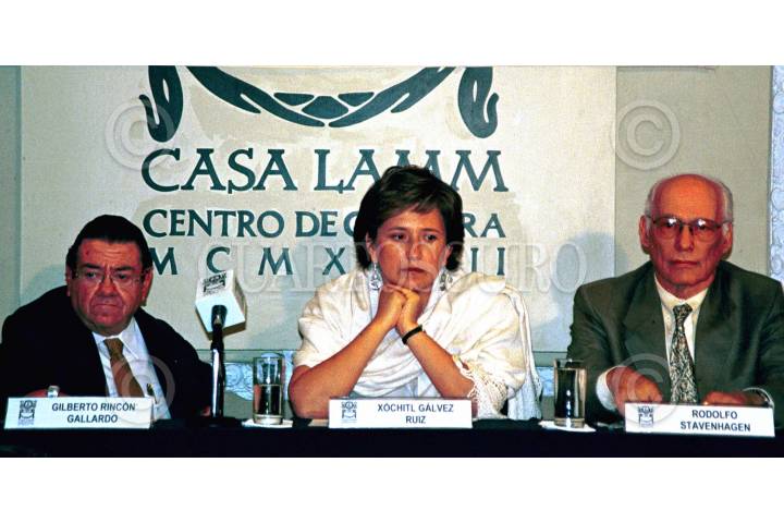 Gilberto Rincón Gallardo, Xochilt Galvez y Rodolfo Stavenhagen, relator especial de las naciones unidas, en la conferencia "Mundial contra el racismo la discriminación racial, la xenofobia y otras formas de intolerancia", en casa Lamm. FOTO: Susana Navarrete/CUARTOSCURO.COM