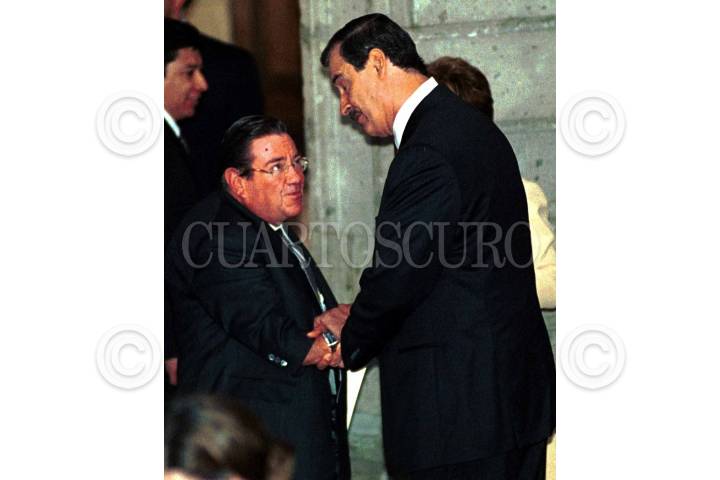 El presidente electo Vicente Fox, saluda a Gilberto Rincón Gallardo, quin es parte del gabinete foxista y fungirá como Presidente del Centro de Estudios Para el Consejo Nacional de Equidad. FOTO: Pedro Mera/CUARTOSCURO.COM