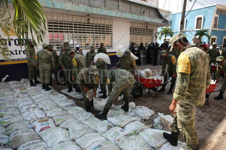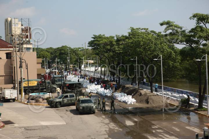 Soldados del Ejército Mexicano y policías estatales se encuentran reforzando las orillas del Río Grijalva con costales de arena, a la altura del malecón Carlos A. Madrazo, ya que hay filtraciones de agua debido a que ha incrementado su caudal.