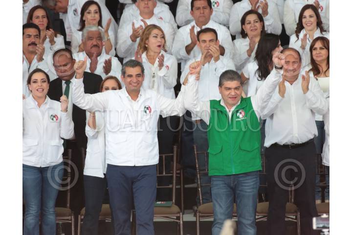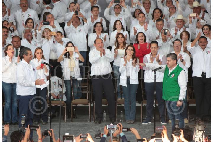 SALTILLO, COAHUILA, 21MARZO2017.- El pasado 18 de marzo, Miguel Ángel Riquelme Solís, rindió protesta como candidato a la gubernatura del estado de Coahuila de Zaragoza, durante la XVI Sesión Ordinaria del Consejo Político Estatal. La tomo de protesta fue hecha por Enrique Ochoa, Presidente Nacional del PRI, donde lo acompaño el gobernador del estado de Coahuila, Rubén Moreira, Claudia Ruiz Massieu, secretaria general del partido, Hilda Flores presidenta del Organismo de Mujeres y senadora por el estado (Coahuila) Verónica Martínez, Presidenta del PRI en Coahuila. FOTO: ALBERTO PUENTE /ARCHIVO /CUARTOSCURO.COM