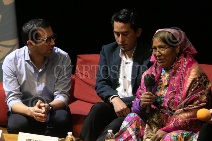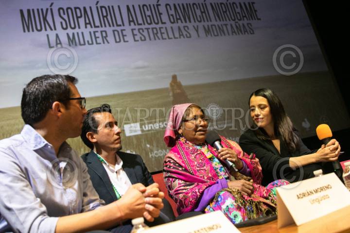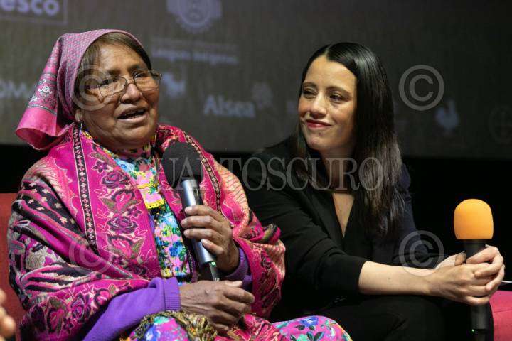 CIUDAD DE MÉXICO, 21FEBRERO2024.- Juana Osorio, es sobrina de Rita, una mujer de origen rarámuri que fue recluida por 12 años en un Hospital Psiquiátrico de Kansas, Estados Unidos, tras ser mal diagnosticada de una enfermedad mental, esta mujer fue liberada tras una batalla legal y repatriada a la Sierra de Chihuahua de donde era originaria. En la cinta se muestra que el ser hablante de una lengua indígena fue estigmatizada y no se le brindo una atención adecuada. Juana, quien estuvo a cargo de Rita en sus últimos año, compartió unas palabras durante la presentación del documental que habla de la vida de su tía y el cual esta titulado "Mukí Sopalírili Aligué Gawichí Nirúgame. La Mujer de Estrellas y Montañas", mismo que fue proyectado en el Centro Cultural Digital en el marco del Día Internacional de la Lengua Materna. FOTO: MOISÉS PABLO/CUARTOSCURO.COM