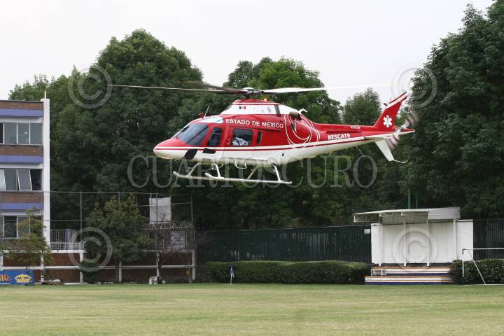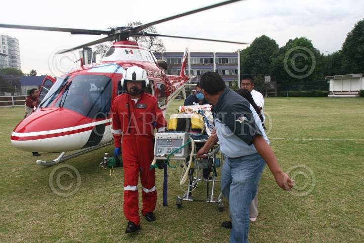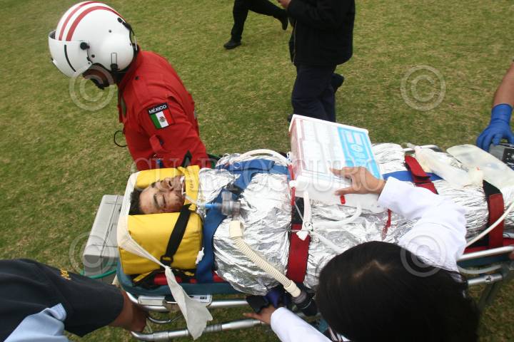 MÉXICO, D.F. 08MARZO2010.- Paramedicos del escuadrón "Relámpagos" trasladaron en helicóptero del municipio de Texcoco hacia el Distrito Federal a Roberto Segura Aguilar de 34 años de edad después que resultó lesionado al explotarle un polvorín en la comunidad de Vicente Riva Palacio.. FOTO: SAÚL LÓPEZ/CUARTOSCURO.COM