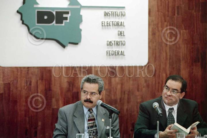 Javier Santiago Castilla, Consejero Presidente del Instituto Electoral del D. F., y Adolfo Riva, Secretario Ejecutivo, durante la sesión de este instituto esta mañana.