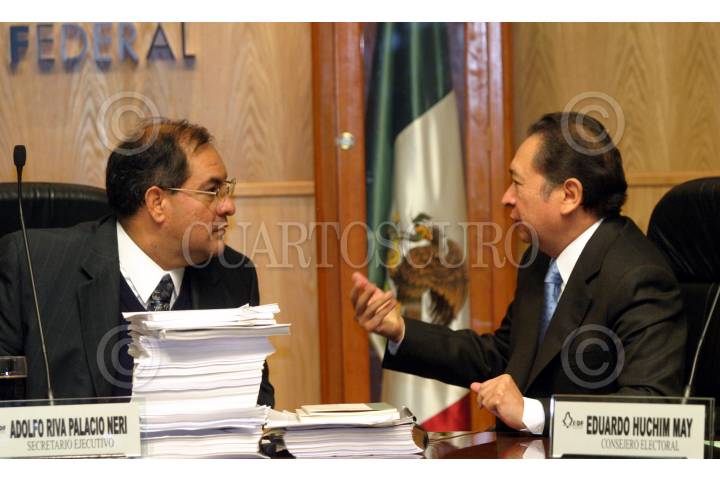MEXICO, D.F. 15 DICIEMBRE 2004.- Adolfo Riva Palacio Neri, secretario ejecutivo y Eduardo Huchim May, consejero electoral, durante la sesión extraordinaria del IEDF, donde se realiza un dictamen de los topes de campaña del panista Santiago Creel, secrtetario de Gobernación. FOTO: Sandra Perdomo/CUARTOSCURO.COM