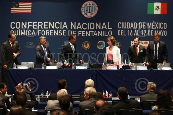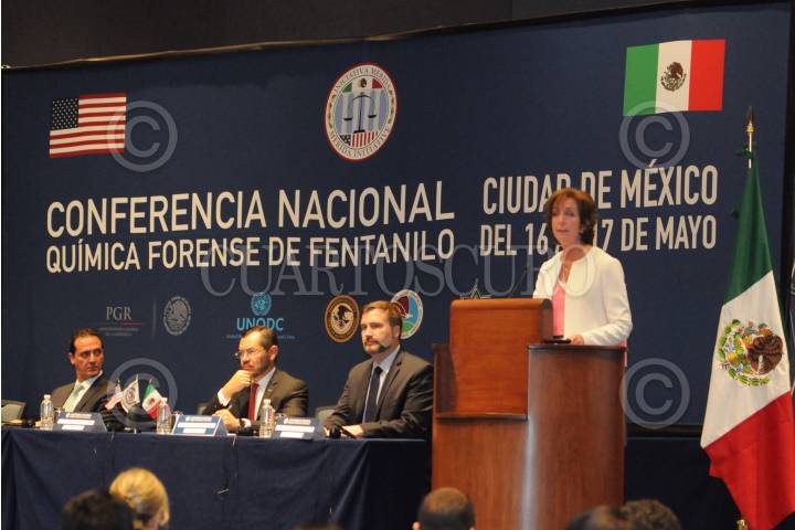 CIUDAD DE MÉXICO, 16MAYO2017.- Alberto Elías Beltrán, subprocurador de Asuntos Jurídicos e Internacionales de la Procuraduría General de la República (PGR), y la embajadora estadounidense Roberta Jacobson, durante la inauguración la Conferencia Nacional de Química Forense de Fentanilo. FOTO: PGR /CUARTOSCURO.COM