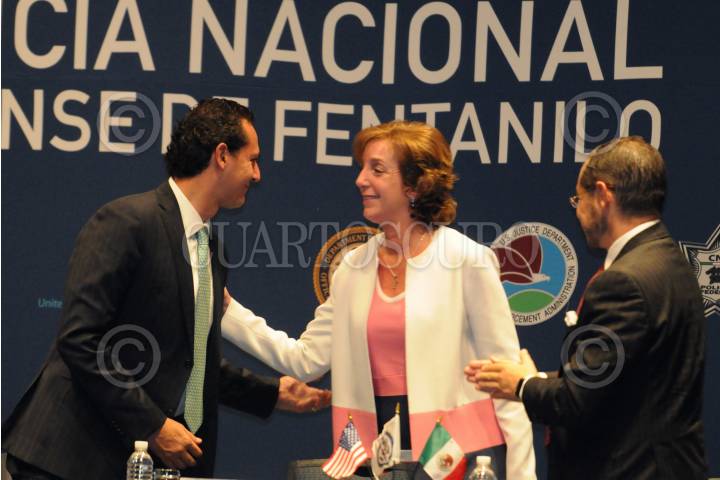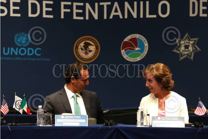 CIUDAD DE MÉXICO, 16MAYO2017.- Alberto Elías Beltrán, subprocurador de Asuntos Jurídicos e Internacionales de la Procuraduría General de la Republica (PGR), y la embajadora estadounidense Roberta Jacobson, durante la inauguración la Conferencia Nacional de Química Forense de Fentanilo. FOTO: MOISÉS PABLO /CUARTOSCURO.COM