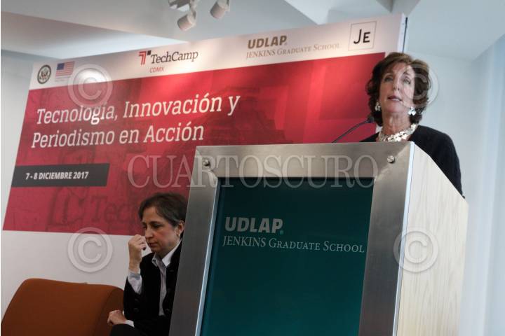 CIUDAD DE MÉXICO, 07DICIEMBRE2017.- La periodista Carmen Aristegui; la embajadora estadounidense Roberta Jacobson, y Luis Ernesto Derbez, rector de la Universidad de las Américas Puebla, inauguraron el encuentro "TechCamp: Tecnología, Innovación y Periodismo en Acción", un taller en que participaron comuniadores de México y Centroamérica. FOTO: MOISÉS PABLO /CUARTOSCURO.COM