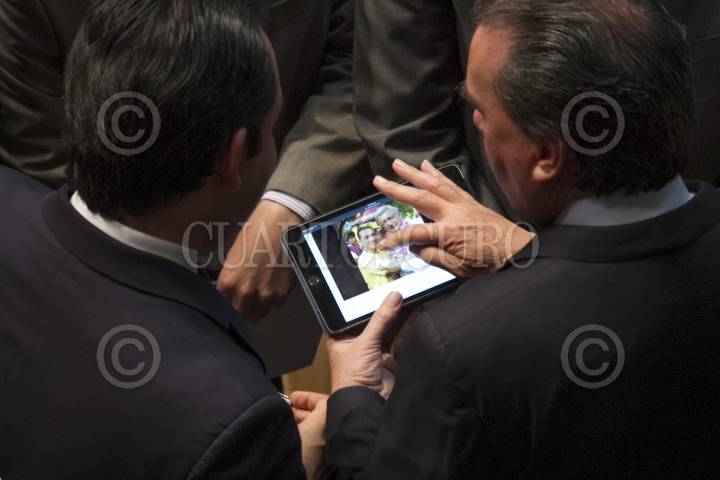 CIUDAD DE MÉXICO, 15NOVIEMBRE2016.- Los senadores priistas Roberto Albores Gleason y Emilio Gamboa Patrón, observan en una tableta la foto de Andrés Manuel López Obrador, con el que fuera presidente municipal de Iguala, José Luis Abarca, quien actualmente esta preso por el caso de la desaparición de los 43 normalistas de la escuela normal "Raúl Isidro Burgos". Hoy se aprobó la entrega de la medalla Belisario Domínguez, al ingeniero Gonzalo Rivas Cámara, quien perdió la vida al intentar controlar un incendio en una gasolinera en Chilpancingo, durante las protestas del magisterio en contra de la Reforma Educativa. FOTO: MOISÉS PABLO /CUARTOSCURO.COM