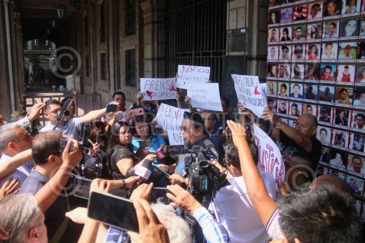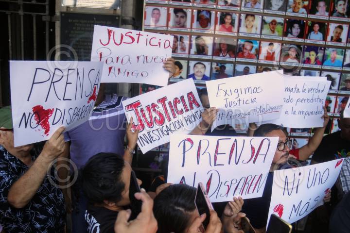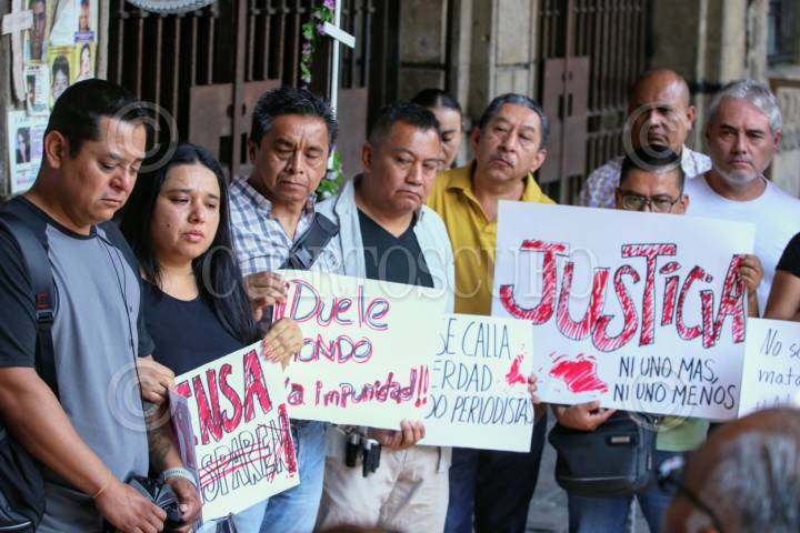 CUERNAVACA, MORELOS, 30ABRIL2024.- En el tercer día de protestas del gremio periodístico de Morelos, reporteros, periodistas, camarógrafos y fotógrafos, exigieron Samuel Sotelo, gobernador interino, una reunión para exponer el caso del secuestro y posterior asesinato del periodista y productor Roberto Carlos Figueroa. Los representantes de los medios de comunicación no fueron recibidos aduciendo una agenda apretada del gobernador interino, por lo cual tuvieron que cerrar la calle Galeana, ubicada detrás del Palacio de Gobierno a fin de ser escuchados. FOTO: MARGARITO PÉREZ RETANA/CUARTOSCURO.COM