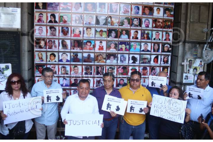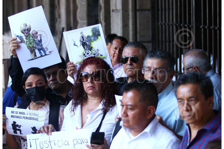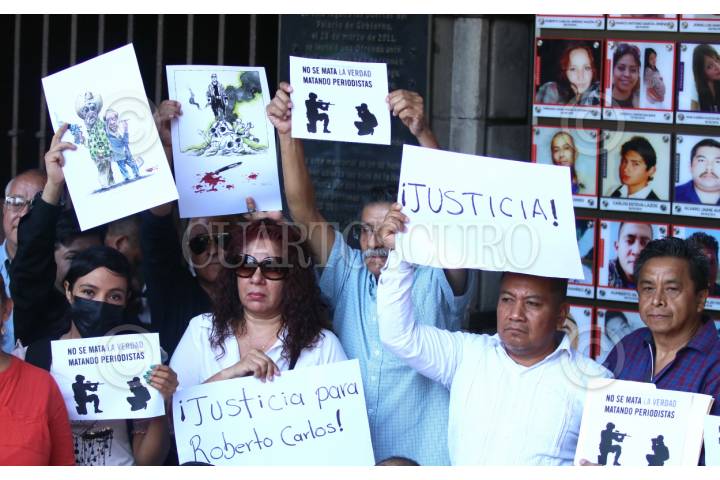CUERNAVACA, MORELOS, 27ABRIL2024.- Periodistas, reporteros, camarógrafos y fotógrafos de Morelos protestaron en el Memorial de las víctimas, en la entrada al Palacio de Gobierno, por el asesinato de Roberto Carlos Figueroa, reportero y productor que ayer fue secuestrado y después asesinado. El cadáver del periodista fue localizado la tarde de ayer en un camino de terracería que va hacia el bosque de Coajomulco, en el municipio de Huitzilac. Los representantes de los medios de comunicación exigen que las instancias del gobierno de Morelos que se aclare el móvil de su secuestro y posterior asesinato. FOTO: MARGARITO PÉREZ RETANA/CUARTOSCURO.COM