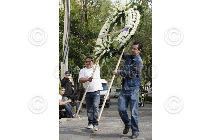 MÉXICO, D.F., 29NOVIEMBRE2014.- El cortejo fúnebre que transportaba los restos de Roberto Gómez Bolaños, mejor conocido como "Chespirito", arribó a las instalaciones de Televisa San Ángel esta tarde, escoltado por elementos de seguridad. Una corona de flores fue enviada por el presidente Enrique Peña Nieto hasta las puertas de la televisora. FOTO: JOSÉ FLORES /CUARTOSCURO.COM