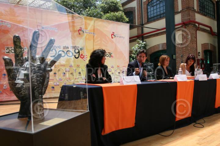 MÉXICO D.F., 24AGOSTO2009.- Begoña Zorrilla, artista plástica, Roberto Gómez Fernández, Marcela Gómez Fernández (hijos de Roberto Gómez Bolaños) y Maca Rotte, presidenta de la Fundación Chespirito, en conferencia de prensa dieron a conocer lo que es la donación de la obra de diversos artistas plásticos la cual seré subastada en apoyo a niñez mexicana, la exposición de estas esculturas será del 24 de Agosto en Plaza Loreto y continuara un recorrido por diversos centros comerciales. FOTO: GUILLERMO PEREA /CUARTOSCURO.COM