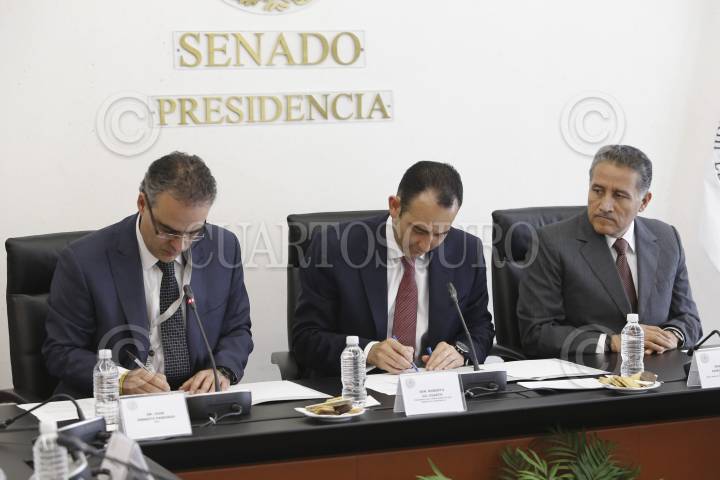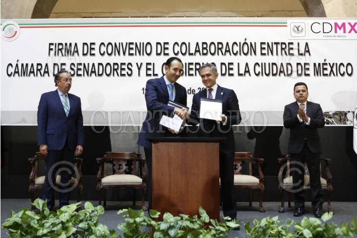 CIUDAD DE MÉXICO, 16AGOSTO2016.- Roberto Gil Zuarth, presidente de la mesa directiva del Senado de la República, Miguel Ángel Mancera Espinosa, Jefe de Gobierno de la Ciudad de México, Manuel Granados Covarruvias, Consejero Jurídico y de Servicios Legales del Gobierno de la Ciudad de México y el Secretario General Servicios Administrativos, Roberto Figueroa Martinez durante la firma del convenio de colaboración entre la Cámara de Senadores y el Gobierno de la Ciudad de México. FOTO: SENADO /CUARTOSCURO.COM