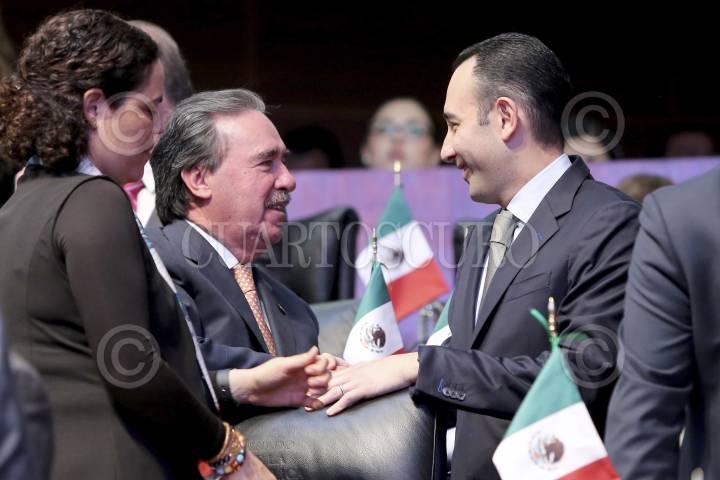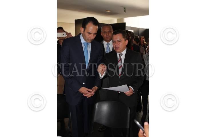CIUDAD DE MÉXICO, 16AGOSTO2016.- Roberto Gil Zuarth, presidente del Senado, y Manuel Granados Covarrubias, consejero jurídico de la Ciudad de México y secretario técnico de la comisión ejecutiva del grupo redactor del proyecto de Constitución de la Ciudad de México, durante la inauguracion de la jornada notarial en el Senado de la Republica. FOTO: MOISÉS PABLO /CUARTOSCURO.