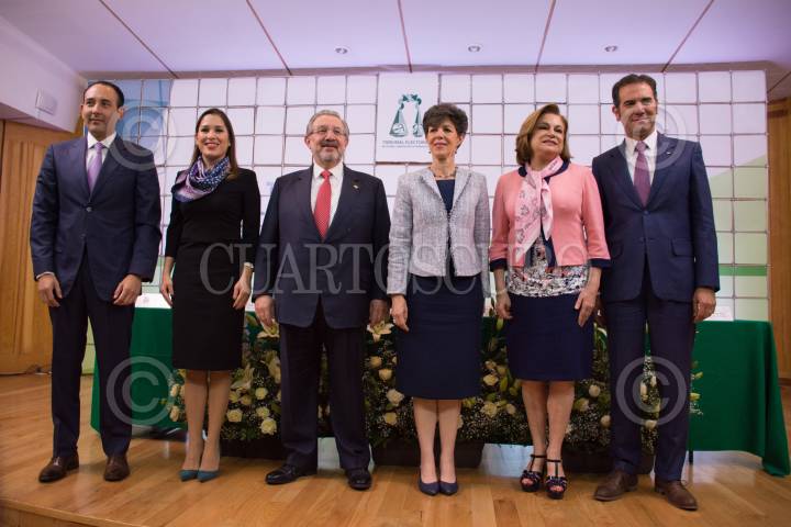 CIUDAD DE MÉXICO, 2MAYO2017.- Luis María Aguilar Morales, ministro presidente de la Suprema Corte de Justicia de la Nación; Ximena Puente de la Mora, presidenta del Instituto Nacional de Transparencia, Acceso a la Información y Protección de Datos Personales; Lorenzo Córdova, presidente del Consejo General del Instituto Nacional Electoral; Arely Gómez González, Secretaria de la Función Pública; Roberto Gil Zuarth, senador de la Repúbica; Janine M. Otálora Malassis, magistrada presidenta de la Sala Superior del Tribunal Electoral del Poder Judicial de la Federación, durante la inauguración del seminario Diálogos para la Justicia Abierta por parte del Tribunal Electoral del Poder Judicial de la Federación, el tema central fue recuperar la confianza de la ciudadanía en las instituciones electorales. FOTO: MARIO JASSO /CUARTOSCURO.COM