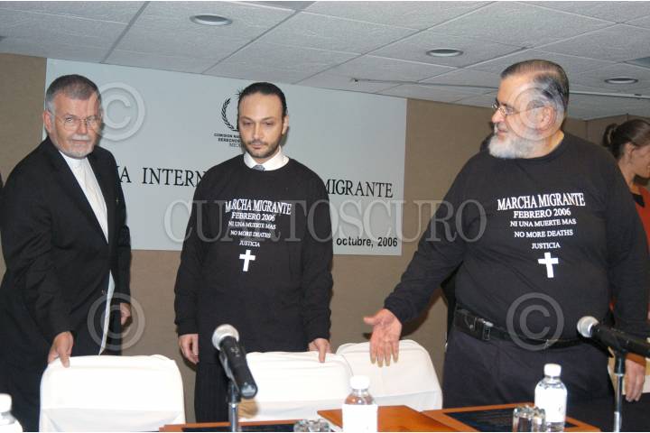 MÉXICO, D.F. 09OCTUBRE2006.- Robin Hoover, de la organización Fonteras Compasivas; Mauricio Farah, quinto visitador general de la CNDH y José Luis Soberanes, titular de la Comisión Nacional de los Derechos Humanos (CNDH) inauguraron la semana internacional del migrante en la CNDH. FOTO: IVÁN STEPHENS/CUARTOSCURO.COM