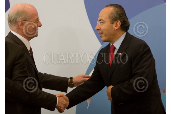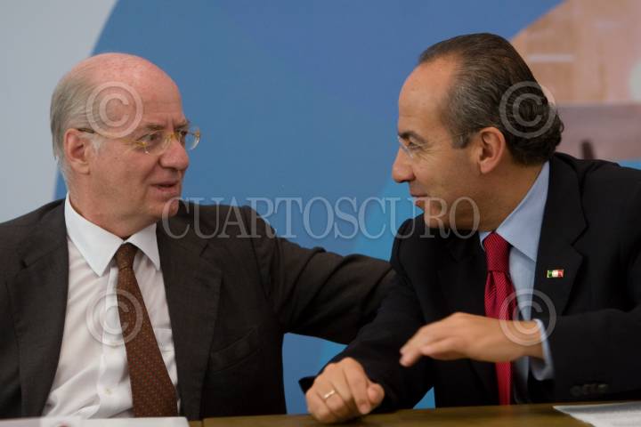 MÉXICO, D.F., 08OCTUBRE2008.- Paolo Rocca, Presidente del Grupo Techint y Felipe Calderón Hinojosa, Presidente de México, conversan durante el anuncio que se realizó en la residencia oficial de Los Pinos "Creciendo con México". FOTO: MOISÉS PABLO/CUARTOSCURO.COM