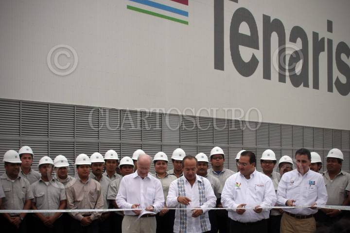 VERACRUZ, VERACRUZ, 17MAYO2011.- Paolo Rocca, dueño de Teneris Tamsa, Felipe Calderón Hinojosa, Presidente de México, Javier Duarte de Ochoa, gobernador de la entidad, y Bruno Ferrari, Secretario de Economía, inauguraron la nueva planta laminadora de la fábrica de tubos de acero más grande del país Tenaris Tamsa. FOTO: FÉLIX MÁRQUEZ/CUARTOSCURO.COM