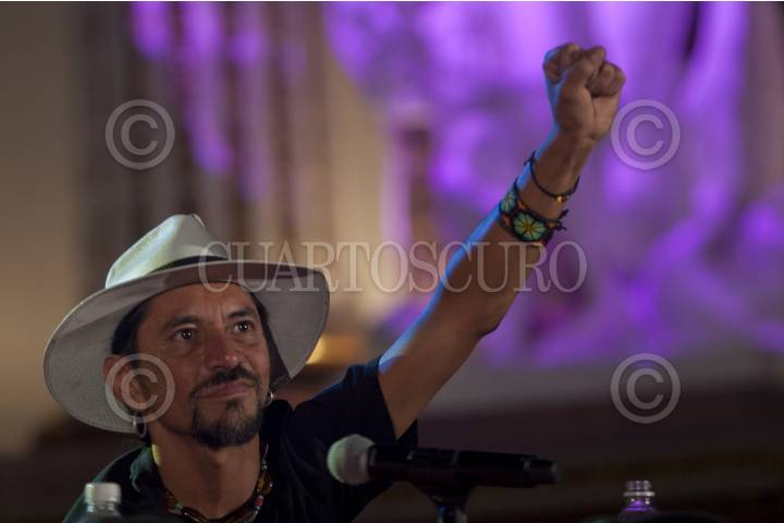 MÉXICO, D.F., 22MAYO2012.- El exvocalista de La Maldita Vecindad y los Hijos del Quinto Patio, miembro del colectivo AHO, levanata el puño durante la conferencia de prensa que ofrecieron con motivo del Wirikuta Fest, próximo a realizarse el 26 de este mes en el Foro Sol, el movimiento pretende denunciar la acción de las mineras canadienses en territorio wixarika para extraer metales preciosos en zona sagrada para este pueblo indigena, con la anuencia de los gobiernos estatles y federales. Los fondos se prentenden destinar a proyectos de desarrollo y a l a defensa de la zona sagrada. FOTO: FRANCISCO RODRÍGUEZ /CUARTOSCURO.COM