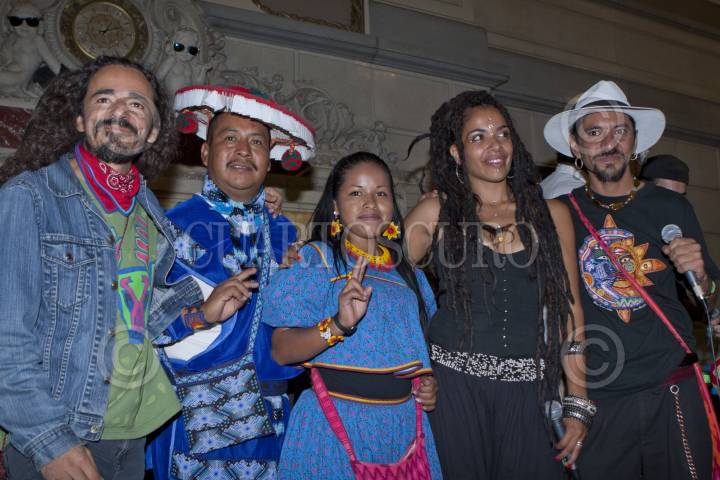 MÉXICO, D.F., 22MAYO2012.- Rubén Albarrán, vocalista de Café Tacuva, Venado Azul y su esposa, indigenas Wixarika, Moyeney Valdéz, vocalista de Sonidero Meztizo y Rocco, exvocalista de La Maldita Vecindad y los Hijos del Quinto Patio, todos miembro del colectivo AHO, ofrecieron conferencia de prensa con motivo del Wirikuta Fest, próximo a realizarse el 26 de este mes en el Foro Sol, el movimiento pretende denunciar la acción de las mineras canadienses en territorio wixarika para extraer metales preciosos en zona sagrada para este pueblo indigena, con la anuencia de los gobiernos estatales y federales. Los fondos se prentenden destinar a proyectos de desarrollo y a la defensa de la zona sagrada. FOTO: FRANCISCO RODRÍGUEZ /CUARTOSCURO.COM