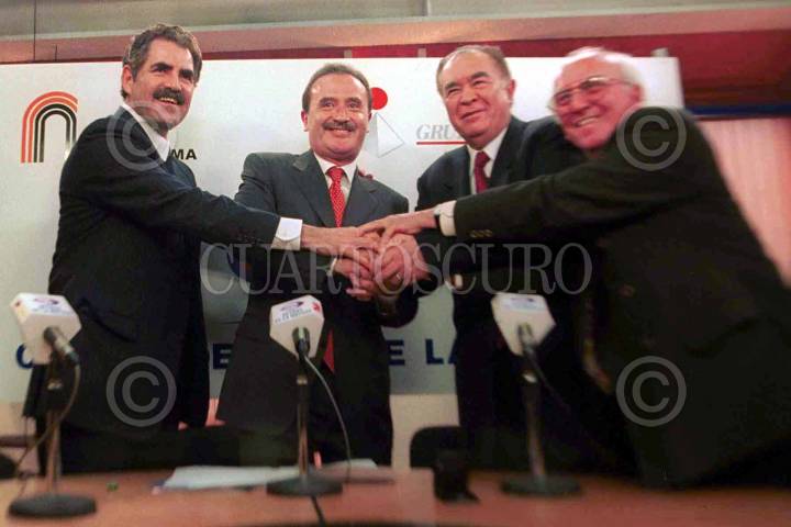 Ing. Rafael Borbón presidente de Radiocima, Ricardo Rocha Pdte. de Detrás de la Noticia y Javier Pérez de Anda Pdte. de Radiorama conforman Cadena Detrás De la Noticia que inicia transmisión el 2 de Julio. FOTO: Francisco Rodríguez/CUARTOSCURO.COM
