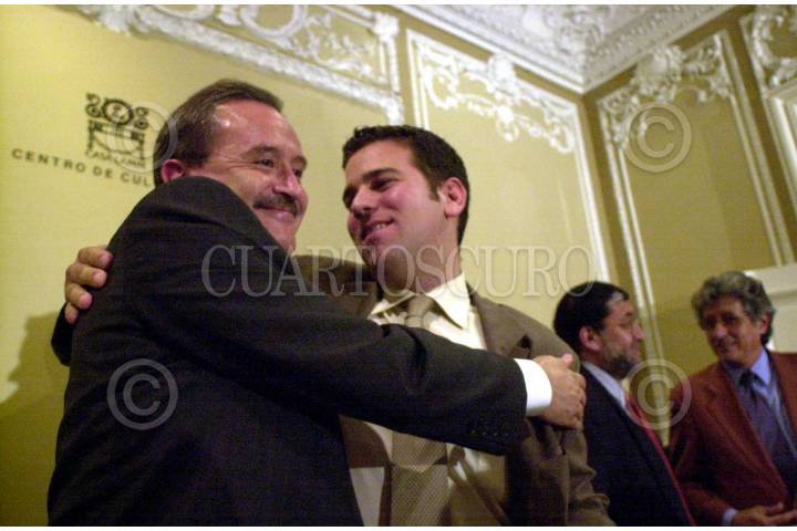 Ricardo Rocha, director de la Agencia Detras de la Noticia felicita a Carlos Loret de Mola por la publicación de su libro, en Casa Lamm. FOTO:Oswaldo Ramírez/CUARTOSCURO.COM