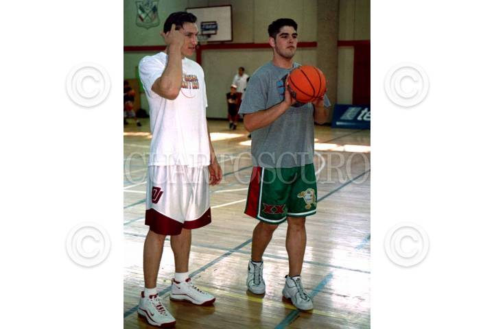 Los mexicanos Eduardo Najera y Jorge Rochín durante la clinica de basquetbol en el colegio americano esta mañana.