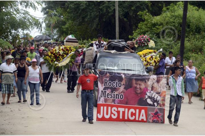 ATOYAC DE ÁLVAREZ, GUERRERO, 20OCTUBRE2013.- Organizaciones sociales como el Movimiento Social de Izquierda, encabezado por Ranferi Hernández Acevedo; el Frente de Defensa Popular; el colectivo Mujeres Solidarias; además de la diputada federal por el PRD, Rosario Merlín, asistieron al velorio de cuerpo presente de la líder de la OCSS Rocío Mesino Mesino, asesinada el sábado por la tarde en las inmediaciones de Mexcaltepec. El velorio se llevó a cabo en la explanada donde se encuentra el obelisco del profesor Lucio Cabañas Barrientos, en el zócalo de Atoyac, donde sonaron las campanas por más de 2 minutos, antes de ser trasladada al panteón Lomas del Sur. FOTO: BERNANDINO HERNÁNDEZ /CUARTOSCURO.COM