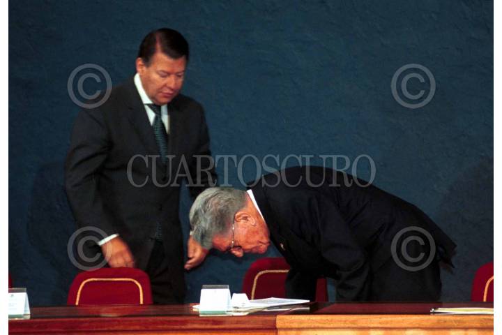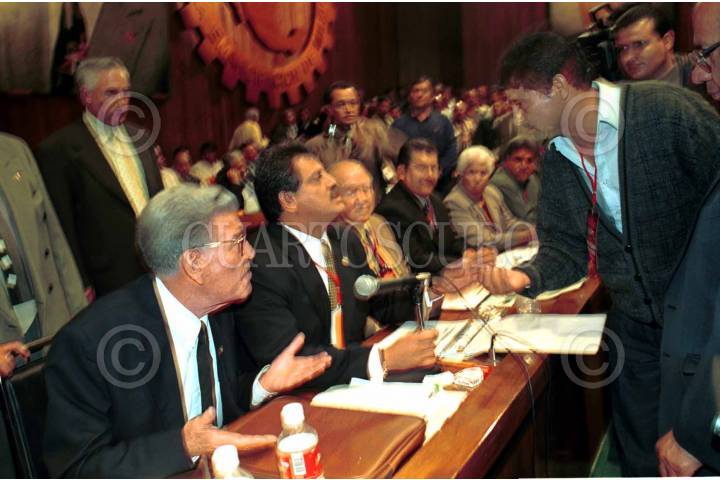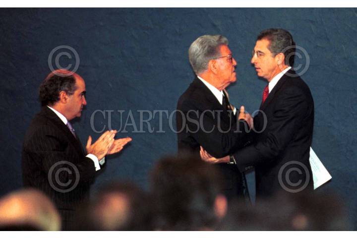 Leonardo Rodriguez Alcaine, líder de la CTM saluda al presidente Zedillo, durante la inauguracion del Congreso Nacional del Sindicato Unico de Trabajadores Electricistas de la Republica Mexicana, esta mañana en la Residencia Oficial de Los Pinos. FOTO: Christian Palma/CUARTOSCURO.COM