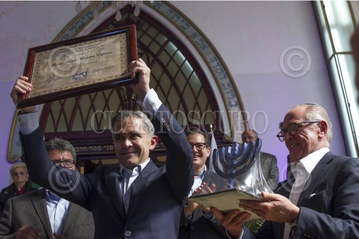 CIUDAD DE MÉXICO, 06NOVIEMBRE2016.- Miguel Ángel Mancera, Jefe de Gobierno, acudió a la presentación del proyecto de construcción del Centro de Documentación e Investigación Judío de México (CDIJUM), el cual estará a un lado de la sinagoga "Rodfe Sedek", de la comunidad Maguén David, ubicada en la calle de Córdoba 238, en la colonia Roma. En una ceremonia en la cual se mostró la maqueta de este centro y se colocó la primera piedra. Rubén Goldberg, presidente del CDIJUM, le entregó un reconocimiento al mandatario capitalino. FOTO: MOISÉS PABLO /CUARTOSCURO.COM