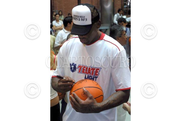 MONTERREY, NUEVO LEON 08OCTUBRE2004 El basquetbolista Dennis Rodman, firma un balón despuesde la conferencia de prensa, donde se anuncio que reforzara al equipo mexicano Fuerza Regia, que participa en la Liga Nacional de Baloncesto Profesional. FOTO: Jorge López/CUARTOSCURO.COM