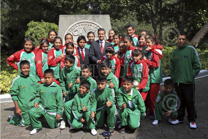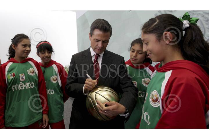 MÉXICO, D.F., 25OCTUBRE2013.- El equipo infantil femenil de basquetbol Bayonetas del estado de Puebla y el equipo infantil varonil de basquetbol Triqui del estado de Oaxaca, quienes ganaron Festival Mini Básquet en Argentina, fueron recibidos en la residencia oficial de los Pinos por Enrique Peña Nieto, presidente de México. FOTO: PRESIDENCIA /CUARTOSCURO.COM