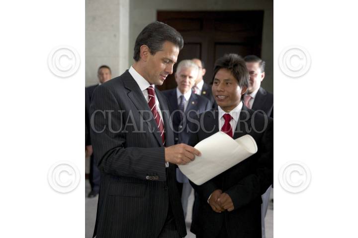 MÉXICO, D.F., 25OCTUBRE2013.- En el marco de la visita del equipo infantil femenil de basquetbol Bayonetas del estado de Puebla y el equipo infantil varonil de basquetbol Triqui del estado de Oaxaca, Enrique Peña Nieto felicitó a Rodolfo Domínguez, actor indígena, por el reconocimiento que recibió en el Festival de Cannes tras su participación en la película La Jaula de Oro. FOTO: PRESIDENCIA /CUARTOSCURO.COM