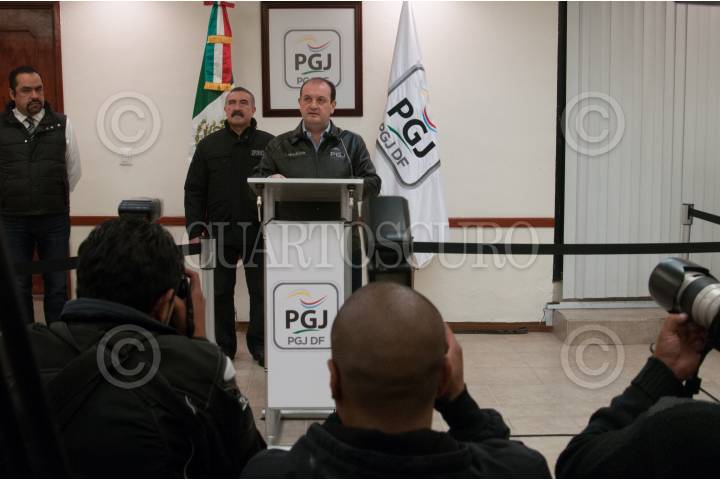 MÉXICO, D.F., 28DICIEMBRE2014.- Rodolfo Rios Garza, procurador capitalino, ofreció una conferencia de prensa para informar y esclarecer los hechos de la noche del pasado 24 de diciembre, cuando una persona asesino a 5 integrantes de una familia en un domicilio de la colonia Tlapechico, delegación Álvaro Obregón. El probable responsable es el sobrino de la familia, Iván Mena Trejo, quien se contradijo en las declaraciones y al final aceptó su participación, quien afirmó haberlo hecho para quedarse con un negocio familiar. FOTO: DIEGO SIMÓN SÁNCHEZ /CUARTOSCURO.COM