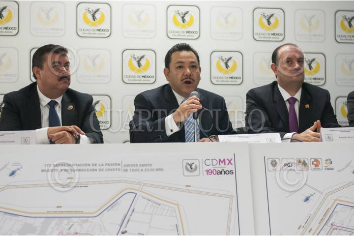 MEXICO, D.F., 30MARZO2015.- Hiram Almeida, titular de la Secretaría de Seguridad Pública, Héctor Serrano, secretario de gobierno capitalino, y Rodolfo Ríos, procurador de justicia capitalino, ofrecieron una conferencia de prensa para ofrecer detalles sobre los operativos de seguridad que implementarán durante la Semana Santa, principalmente en Iztapalapa, donde se llevará a cabo la 172 representación de la pasión de Cristo. FOTO: DIEGO SIMÓN SÁNCHEZ /CUARTOSCURO.COM