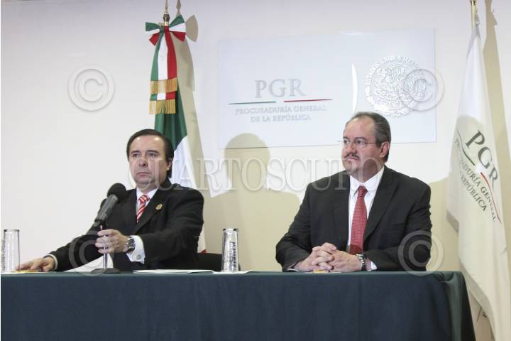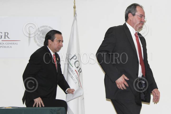 MÉXICO, D.F., 09ABRIL2014.- Tomás Zerón De Lucio, director en jefe de la Agencia de Investigación Criminal acompañado de Rodrigo Archundia Barrientos, subprocurador especializado en investigación de delincuencia organizada, ofrecieron un comunicado en las instalaciones de la PGR para informar la detención de Feliciano Álvarez Mesino, edil de Cuetzalan, Guerrero, quien presuntamente brindaba protección a grupos criminales y quien se le vincula con al menos 15 secuestros cometidos en diferentes municipios de Guerrero. FOTO: SAÚL LÓPEZ /CUARTOSCURO.COM