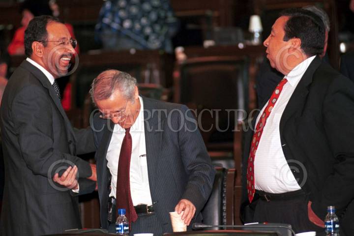Diego Fernández de Cevallos, Juan José Rodríiguez Pratts y Enrique Jackson, durante un receso en la sesión ordinaria del Senado. FOTO:Oswaldo Ramírez/CUARTOSCURO.COM