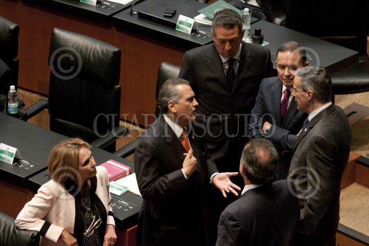 MÉXICO, D.F., 20OCTUBRE2011.- Los senadores Amira Gómez Tueme, PRI, Manlio Fabio Beltrones, coodinador del PRI, Rogelio Rueda Sánchez, PRI, Fernando Castro Trenti, PRI y José González Morfín, presidente de la mesa directiva del Senado, durante la sesión en la que se ratificó la medalla Belisario Domínguez a el Ingeniero Cuauhtémoc Cárdenas. FOTO: MOISÉS PABLO/CUARTOSCURO.COM