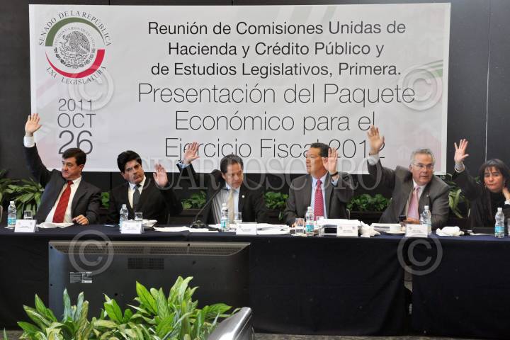 MÉXICO, D.F., 26OCTUBRE2011.- Los senadores Angel Díaz Caneja, Tomás Torres, José Isabel Trejo, Rogelio Rueda, y Javier Castelo Parada, durante una votación en la reunión de Comisiones Unidas de Hacienda y Crédito Público para el análisis del Paquete Económico para el Ejercicio Fiscal 2012. FOTO: CUARTOSCURO.COM