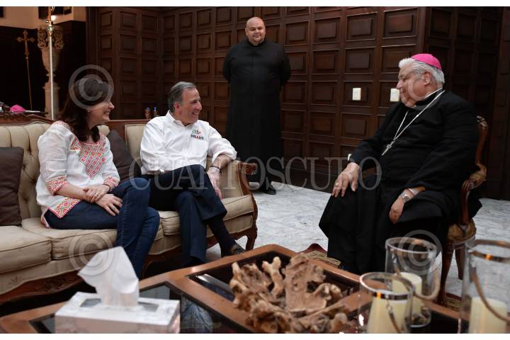 MONTERREY, NUEVO LEÓN, 18ABRIL2018.- Dentro de su jornada proselitista de este miércoles en Nuevo León, el candidato presidencial de la coalición Todos por México, José Antonio Meade, se dio tiempo para visitar al Arzobispo de Monterrey, Rogelio Cabrera López, en su oficina ubicada a un costado de la Catedral regiomontana. El aspirante a la Presidencia de la República, quien estuvo acompañado por su esposa, Juana Cuevas, conversó con el prelado de la iglesia católica sobre temas de interés para la entidad, al igual que lo hizo con los distintos sectores del estado. FOTO: CUARTOSCURO.COM